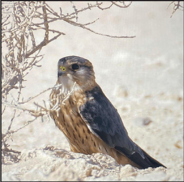 Amur Falcon Falco amurensis. All records Irkayya Farm and all by Sheikh M Al Thani: a juvenile/female bird, 11 November 2020; three juvenile/female birds, 29 November 2020; one juvenile/female, 2-15 December 2020 (Plate 7); one adult male, 23 March 2021; one juvenile/female, 27 March-3 April 2021. 8th-12th records.